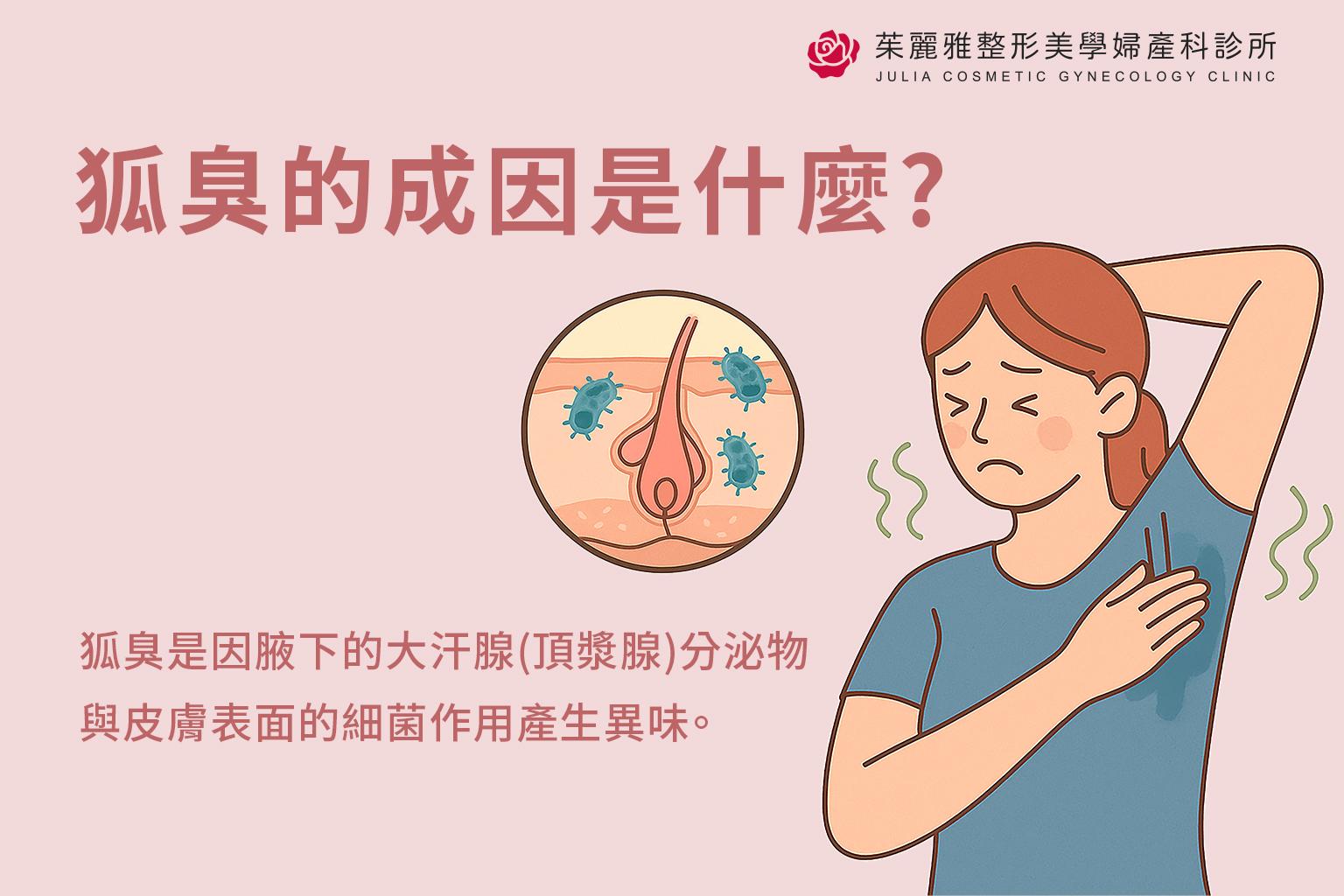 狐臭是因腋下的大汗腺(頂漿腺)分泌物與皮膚表面的細菌作用產生異味。這通常是遺傳性體質,在青春期之後會更明顯。