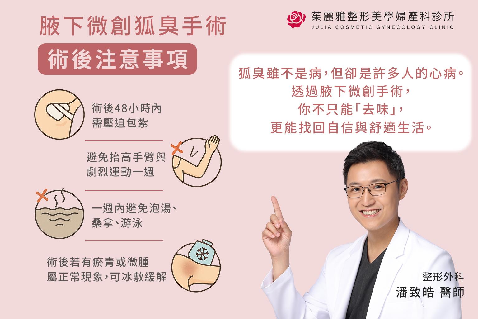 「 狐臭雖不是病,但卻是許多人的心病。透過腋下微創手術,你不只能「去味」,更能找回自信與舒適生活。」—整形外科 潘致皓醫師